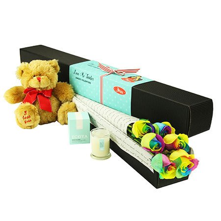 Change it up this Valentines Day with our super popular rainbow roses accompanied by an adorable teddy bear for an extra touch of `cute`.