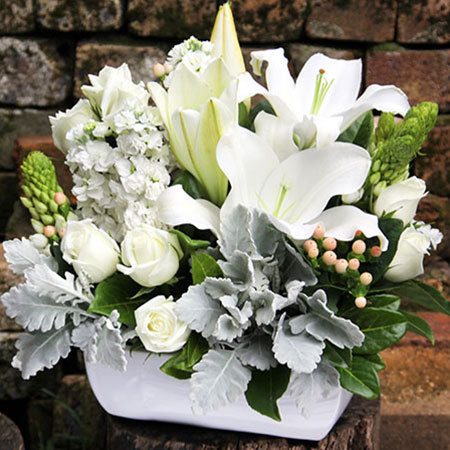 A classic flower arrangement of scented blooms in fresh white, green and silver. Conveniently arranged by our florists in a white ceramic pot, it features a floral garden of perfumed oriental lilies, pure white roses, silvery dusty miller leaves, and fluffy white stems of stock (or similar), alongside seasonal blooms and berries. This flower arrangement`s heady scent is sure to invoke memories shared with loved ones. Organise a flower delivery via our website, email us directly or speak to one of our qualified floral consultants toll free.