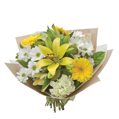 A bright, mixed pastel bouquet sure to make their day, Adina makes the perfect gift for any occasion. Bursting with fresh yellow and white blooms nestled among green foliage and handcrafted by a local florist, Adina is perfectly wrapped and tied with green ribbon. Welcome them into summer with a beautiful bouquet today.