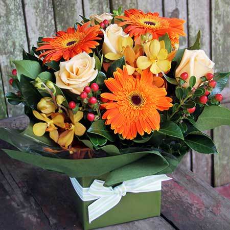 This boxed arrangement of fresh flowers in Autumn tones is one of our best sellers. A gorgeous combination of orange vanda orchids, pale apricot roses, deep orange gerbera daisies and seasonal berries designed by our talented florist team is both beautiful and great value! To send flowers, simply place your order via our online florist shop, email us directly or give the team a call toll free.