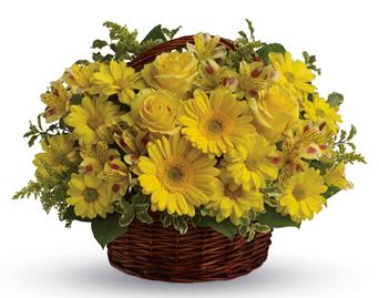 They’ll be walking on sunshine after receiving this cheerful basket of roses, gerberas, alstroemeria and daisies! Flowers are subject to seasonal availability. In the event that any of the flowers are unavailable, the florist will substitute with a similar flower in the same shape, style and colour. Stem count, packaging and container may vary. Standard (Pictured Price) : A57