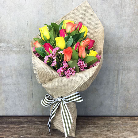 This fabulous, bright posy of mixed roses in hot pink, yellow and orange is combined with fresh greenery and presented in a rustic hessian wrap. A gorgeous, great value gift for only $39.95! Available for flower delivery in Sydney, Melbourne and Perth metro region. Order your roses online, give us a call or email the Flowers TeamĀ