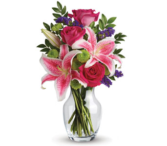 Brighten Mums day with this gorgeous vase arrangement of hot pink roses, pink Stargazer lilies, accented with greens. It’s a delightful gift Mum will never forget! Flowers are subject to seasonal availability. In the event that any of the flowers are unavailable, the florist will substitute with a similar flower in the same shape, style and colour. Stem count, packaging and container may vary. Standard (Pictured Price) : M28V