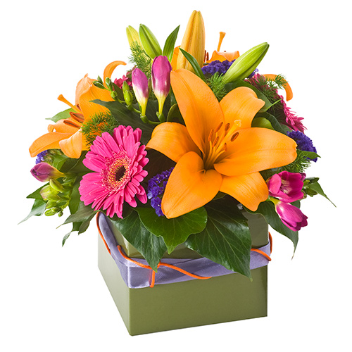 Lilies, gerberas and freesias in hot pink and orange tones are the stars of the show in this arrangement.  Presented in a stylish mini box, this bright display of blooms is one of our best sellers!