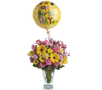 Dazzle someone on their special day with a stunnning vase arrangement. Delightful blossoms and balloon are sure to make their day! Flowers are subject to seasonal and regional availability. Balloons are subject to availability. In the event that the balloon or any of the flowers are unavailable, the florist will substitute with a similar item. Flowers will be substituted in the same shape, style and colour. Balloons will be substituted with the nearest available occasion style. Stem count, packaging and container may vary. Standard (Pictured Price) : C57V