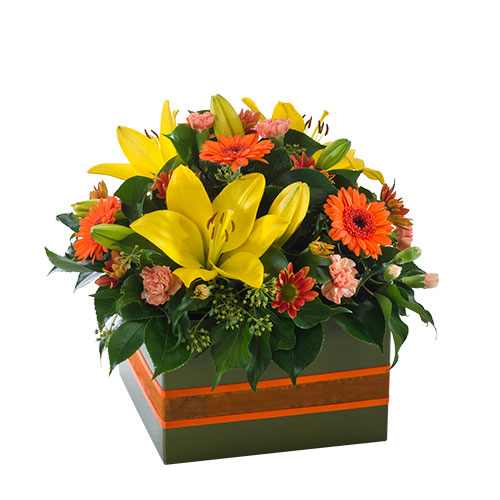 Dazzle them with this delightful floral gift. Mixed blooms in sunshine yellow, warm orange, and soft pink, with lush foliage, sit within a presentation box. Ideal for delivery to a hospital or nursing home, it will brighten any space.