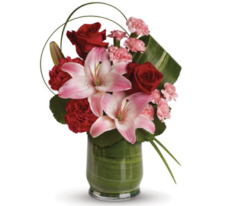 This gorgeous arrangement delivers the spirit of adventure. It’s a unique mix of red roses, pink lilies, leaves and lily grass arranged in a chic leaf lined vase. Flowers are subject to seasonal availability. In the event that any of the flowers are unavailable, the florist will substitute with a similar flower in the same shape, style and colour. Stem count, packaging and container may vary. Standard (Pictured Price) : A54V