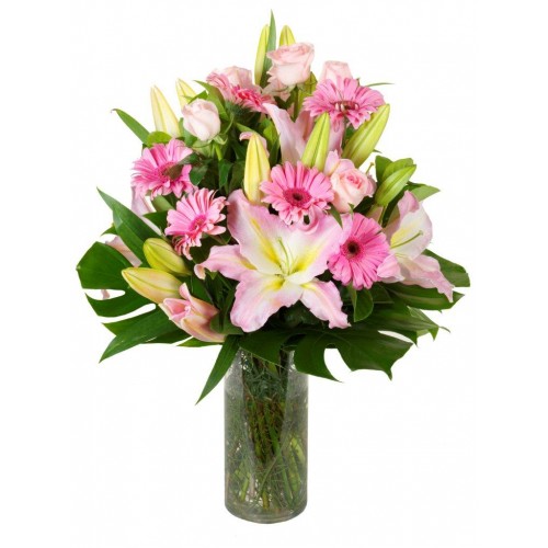 This beautiful pink bouquet of lilies, gerberas and exotic monstereo leaves is opulently fragrant and long lasting. Spoil someone special with these elegant flowers.
