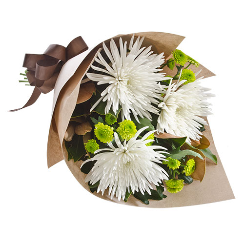 Exuding charm and sophistication, our Fairytale bouquet is sure to impress! This enchanting bouquet features bright white chrysanthemums and lime green button chrysanthemums to dramatic effect. Sweetly trimmed in a delicate satin bow, Fairytale will leave them beaming!