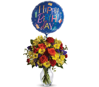Make birthday spirits soar by sending this fabulously fun vase arrangement and balloon. Bright primary colours make it perfect for guys and gals. Flowers are subject to seasonal and regional availability. Balloons are subject to availability. In the event that the balloon or any of the flowers are unavailable, the florist will substitute with a similar item. Flowers will be substituted in the same shape, style and colour. Balloons will be substituted with the nearest available occasion style. Stem count, packaging and container may vary. Standard (Pictured Price) : C56V