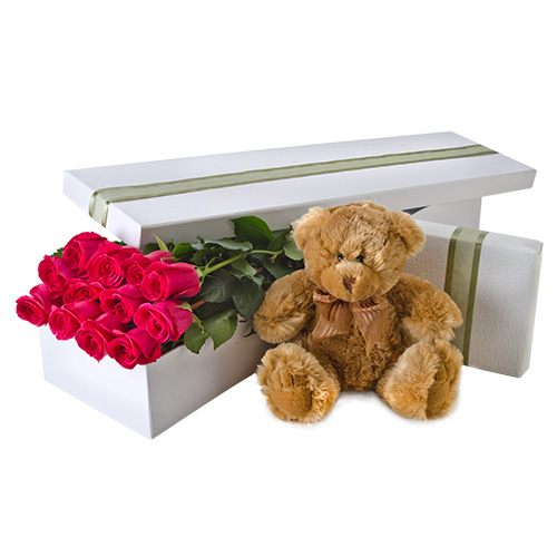 Make your feelings known with Forever Love! Featuring twelve long stemmed roses and a soft small teddy bear and chocolates, Forever Love will leave your loved one beaming!
