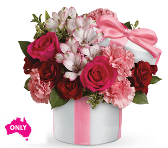 Tickle them pink with this sweetly chic mix. Arranged in a Hats Off Keepsake vase, this arrangement blends hot pink and deep crimson roses with the delicate notes of alstroemeria and carnations. The Hats Off Keepsake vase is 10cm high and 11.5cm wide. The Hats Off Keepsake Vase is only available for delivery in Australia. Flowers are subject to seasonal availability. In the event that any of the flowers are unavailable, the florist will substitute with a similar flower in the same shape, style and colour. Stem count, packaging and container may vary. If the requested Keepsake container is not available, you will be contacted and offered a second choice. Standard (Pictured Price) : K72V