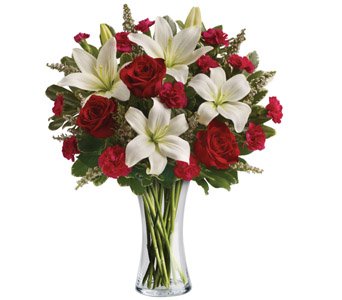 Timeless romantic red roses and fragrant white lilies in a classic glass vase – a sweet yet spectacular way to express what’s in your heart. Flowers are subject to seasonal availability. In the event that any of the flowers are unavailable, the florist will substitute with a similar flower in the same shape, style and colour. Stem count, packaging and container may vary. Standard (Pictured Price) : V14V