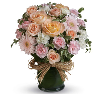 Indeed she is! Show her with this soft symphony of feminine blooms, including roses, gerberas and carnations in a raffia lined vase. Flowers are subject to seasonal availability. In the event that any of the flowers are unavailable, the florist will substitute with a similar flower in the same shape, style and colour. Stem count, packaging and container may vary. Standard (Pictured Price) : A62V