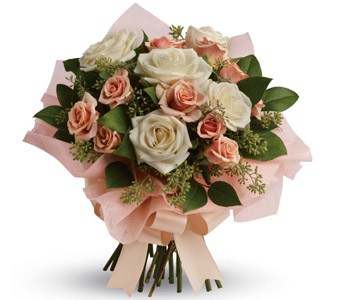 A fresh, feminine spin on the classic rose bouquet, this creamy mix of peach and cream roses is the ultimate in romance. Flowers are subject to seasonal availability. In the event that any of the flowers are unavailable, the florist will substitute with a similar flower in the same shape, style and colour. Stem count, packaging and container may vary. Standard (Pictured Price) : R35