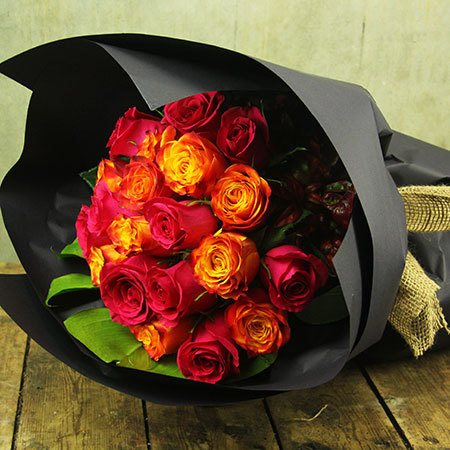 Like the colours of a Balinese sunrise, this exotic rose bouquet beautifully blends vibrant pink roses with golden orange roses to create a juicy little number that looks particularly striking in its smart black wrap. Rhonda would love them! Available in three bouquet sizes or in a designer vase, these gorgeous roses are offset with lush foliage and finished with a burlap tie. Order roses online, by emailing us directly or by giving the team a call.