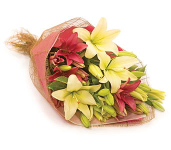 An all-time divine favourite bouquet showcases a combination of long lasting coloured lilies. Flowers are subject to seasonal availability. In the event that any of the flowers are unavailable, the florist will substitute with a similar flower in the same shape, style and colour. Stem count, packaging and container may vary. Standard (Pictured Price) : BE5