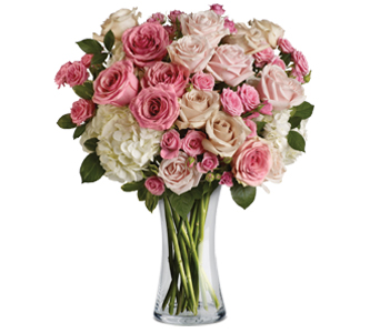 Roses in exquisite shades of pink and cream accented with hydrangea and delivered in a beautiful glass vase. She’ll be totally swept away. Flowers are subject to seasonal availability. In the event that any of the flowers are unavailable, the florist will substitute with a similar flower in the same shape, style and colour. Stem count, packaging and container may vary. Standard (Pictured Price) : M18V