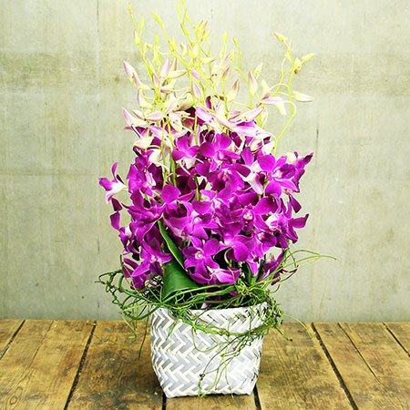 Send our lush orchid flower basket perfect for any occasion! These divine purple Singapore orchids in our groovy chevron-look basket are ideal for celebrating birthdays or the birth of a new baby, and are great for cheering someone up or to say `get well soon`. Send as they are or team with one of our additional gift options, such as a fresh fruit box, bottle of bubbly, chocolate, Ecoya candle or bright balloon.
