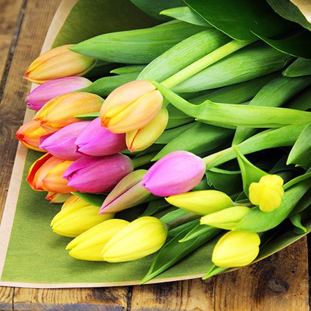 Our fabulous multi-coloured tulip bouquet comes in a gorgeous mix of juicy orange, sunshine yellow and hot pink tulips guaranteed to brighten someone`s day! Available in three size bouquet options, these fun and bright tulips are perfect for any occasion. Order tulips delivered in Australia via our online florist shop, call the Flowers for Everyone team or email us directly