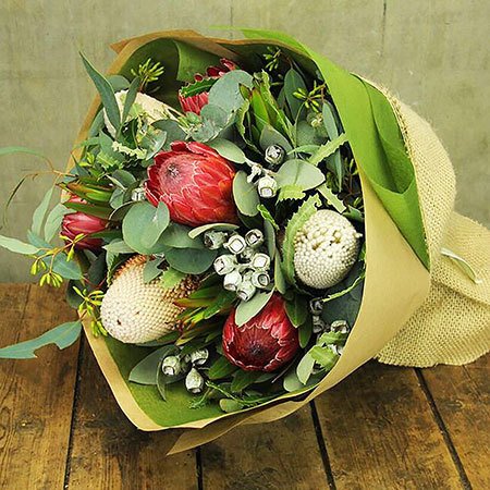 This fresh flower bouquet of seasonal natives including protea and banskia has been designed by our florist team in warm, neutral tones with accents of silvery foliage and gumnuts. For fans of native flowers, this bouquet is perfect and appropriate for any occasion! Order these flowers online, give our helpful team a call toll free or email directly to
