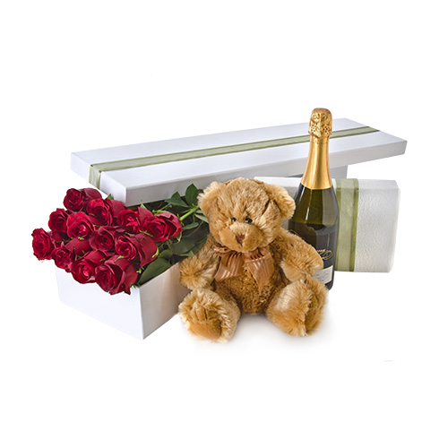 Let One Love send the messages of your heart! With twelve long stemmed red roses delicately arranged in a slender white box, a small teddy bear and a bottle of Australian sparkling wine, nothing says romance quite like One Love!
