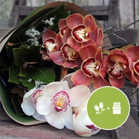 A delectable gift of exotic Cymbidium orchids and premium Italian chocolate! Send a beautiful bouquet of lush orchids with our new Tortina di Cioccolato direct from the Slitti `atelier` in Tuscany. Handmade by award winning chocolatier Andrea Slitti, these 80g European style chocolate disks are produced using the best ingredients. Cymbidium orchids are available in a stunning variety of colours and can last for weeks making them great value! To send our Cymbidium orchid bouquet and Tuscan chocolate combo, simply order via the online florist shop or phone toll free.