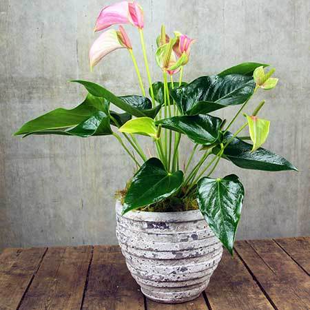 These pretty pink anthurium lily plants make the perfect indoor pot plant. They not only look great in our rustic stone-look pots, they are super easy to care for (when their leaves start to wilt, just give them a water). They do like soft, filtered natural light but otherwise they are perfect for even the novice green thumb! Order these lily plants online or give the team a call FREE.Â