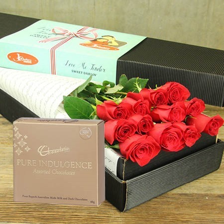 Calling all romantics! Whether it is your anniversary, a saucy follow up after a first date, Valentine’s Day, or a spontaneous ‘just because I think you are awesome’ gesture, one dozen long stem red roses nestled inside our signature presentation box is the perfect gift. Our fab florist team arrange super long stem Columbian red roses amongst folds of soft tissue to create an elegant boxed surprise for your special someone. Available in twelve or twenty four rose stem options, this gift of love also comes with a free little Chocolatier treat to add an extra touch of sweetness.
