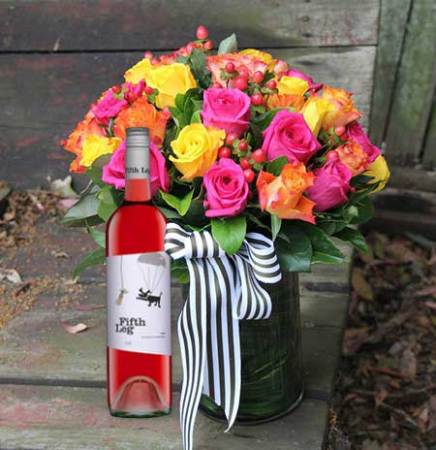 A ‘rose and rose’ combination! One of our best selling flower arrangements has been teamed with a delicious bottle of Fifth Leg Rose. Twenty four colourful mixed roses come arranged in a vase with lush green foliage and an accent of berries – the perfect gift for special occasions, celebrations, birthdays and more. Order this bottle of rose and roses online or give us a call.