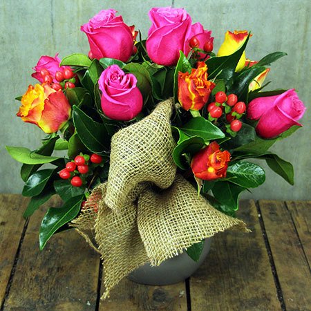 As classic as the famous phrase `La Vie en Rose` or `A Life of Roses`, this elegant flower arrangement features deep and decadent pink roses combined with lush, sunset hued roses to create a mass of gorgeous spring-inspired blooms. Simply designed by our florists in a chic white pot and finished with a touch of berry and fresh, green foliage, these spring blooms are guaranteed to bring a little `joie de vivre`. Order your floral gift from our online florist shop or call toll free. Same day flower delivery for orders received prior to 1pm.