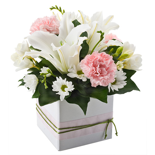 A mini box that is packed to the brim!  Lilies, carnations, daisy chrysanthemums and freesoas feature in soft subtle tones.  Surrounded by choice foliage and presented in a white mini box, this arrangement is the picture of beauty and femininity.