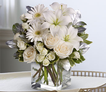 You couldnt wish for a prettier or more dazzling arrangement of wonderful white blossoms. Striking ivory roses, white spray roses, gerberas, asiatic lilies, salal and pittosporum are lovingly arranged in a sparkling clear glass cube. Flowers are subject to seasonal availability. In the event that any of the flowers are unavailable, the florist will substitute with a similar flower in the same shape, style and colour. Stem count, packaging and container may vary. Standard (Pictured Price) : C26