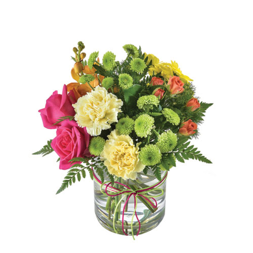 Siobahn is a stunning mixed bouquet in a glass jar. Bursting with colour, this bouquet features yellow sim carnations and daisy chrysanthemum, green button chrysanthemum, pink cerise roses, orange spray roses and mokara orchid nestled between leather furn. Siobahn is the perfect floral gift to brighten their day.