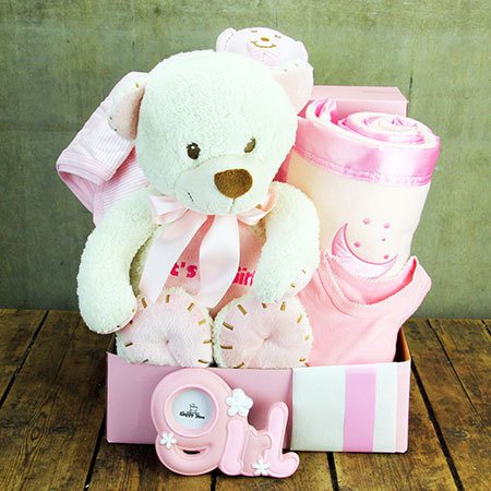 This cutie pie baby hamper available in pink or blue is arranged in a matching gift box and contains: