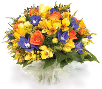 Brighten someones day with this colourful posy-style bouquet of freesias, solidaster, alstroemeria and roses. Flowers are subject to seasonal availability. In the event that any of the flowers are unavailable, the florist will substitute with a similar flower in the same shape, style and colour. Stem count, packaging and container may vary. Standard (Pictured Price) : BE6