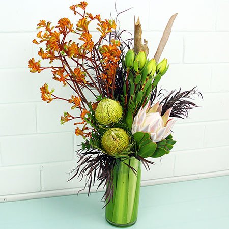 This tall, front facing vase arrangement offers height and a splash of colour. Featuring seasonal, long lasting natives such as banksias, proteas, leucodendron, kangaroo paw, textural grasses and husks grouped in a modern floral style, these office flowers look great on a corner coffee table, against a feature wall or on a reception desk. The basis of this office flower design is a neutral green, white and chocolate colour palette, with a vivid burst of warm orange, yellow or red to add contrast.