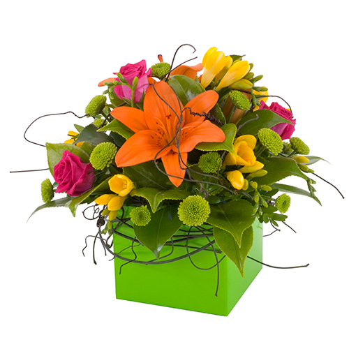 This mini box arrangement is a dazzling display of colour and textures. Lilies, button chrysanthemums and roses are the feature of this delightful box which is guaranteed to put a smile on their dial regardless of the occasion.