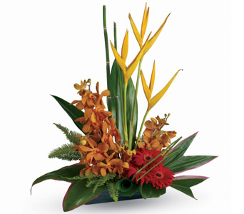 This gorgeous arrangement, with its bold, beautiful flowers and foliage, offers some of the best of the tropics. Flowers are subject to seasonal availability. In the event that any of the flowers are unavailable, the florist will substitute with a similar flower in the same shape, style and colour. Stem count, packaging and container may vary. Standard (Pictured Price) : T4