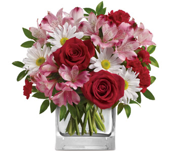 Fresh and fabulous, this stylish blend of white daisies,red roses and pink alstroemeria will brighten any occasion.Arranged inside a glass cube, it will be sure to delight. Flowers are subject to seasonal availability. In the event that any of the flowers are unavailable, the florist will substitute with a similar flower in the same shape, style and colour. Stem count, packaging and container may vary. Standard (Pictured Price) : V12