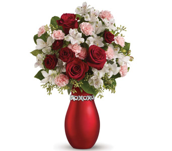 Drive her wild with this gorgeous arrangement of red roses, pink carnations and other romantic favourites. Handarranged in a chic red vase featuring a silver XOXO charm. The XOXO Keepsake Vase is 21cm high. The XOXO Keepsake Vase is only available for delivery in Australia and New Zealand. Flowers are subject to seasonal availability. In the event that any of the flowers are unavailable, the florist will substitute with a similar flower in the same shape, style and colour. Stem count, packaging and container may vary.If the requested keepsake container is not available, you will be contacted and offered a second choice. Standard (Pictured Price) : K4V