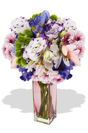 This is a crazy bunch of everything lovely! Blue Iris, mixed Eustoma, an exotic Tiger Lily and Chrysanthemums make this an exuberant burst that is sure to delight your special someone.Vase not included. However, we suggest including a Premium Vase with your gift to make it that much more zany.